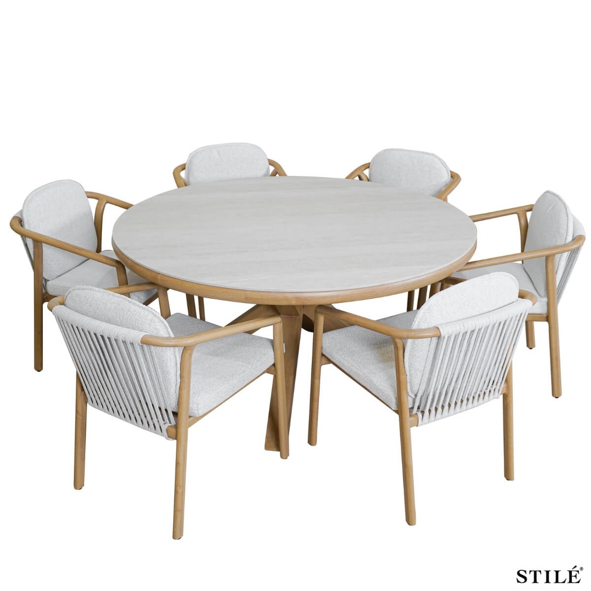Set Tavolo Rotondo da Giardino Ø148 cm in Alluminio Effetto Legno con Sedie in Corda Olifen – Piano in Pietra Sinterizzata