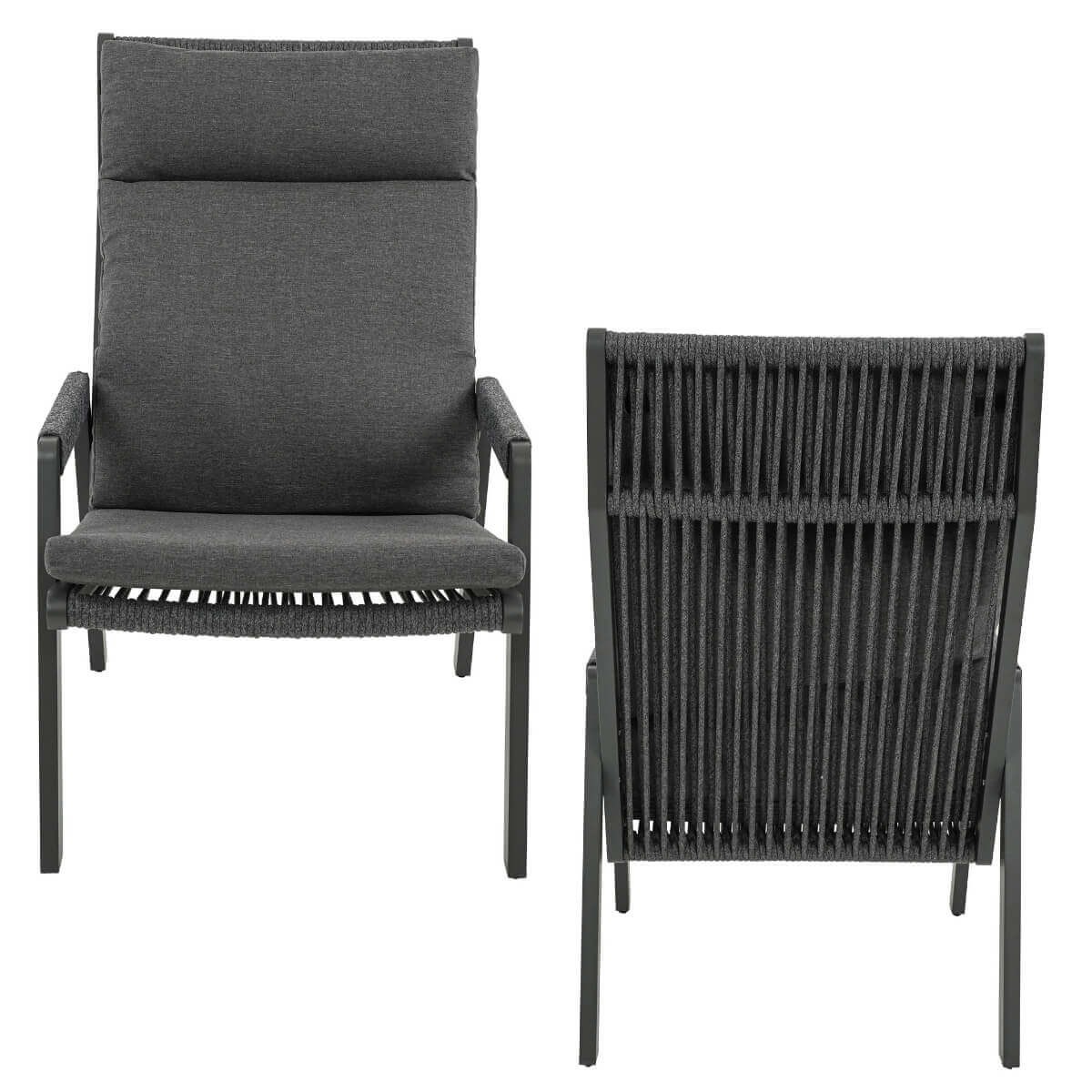 Le poltrone, dalle dimensioni di 72x83x72 cm (L x P x H), offrono un comfort ottimale grazie all'uso di materiali di alta qualità come l'alluminio e la corda intrecciata. La corda, oltre ad aggiungere un tocco di eleganza al design, assicura anche resistenza e durabilità nel tempo.
