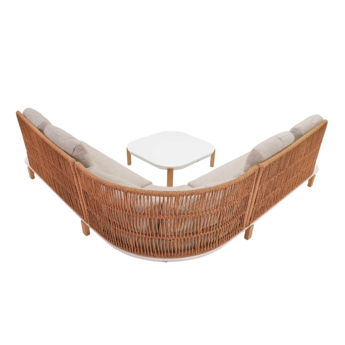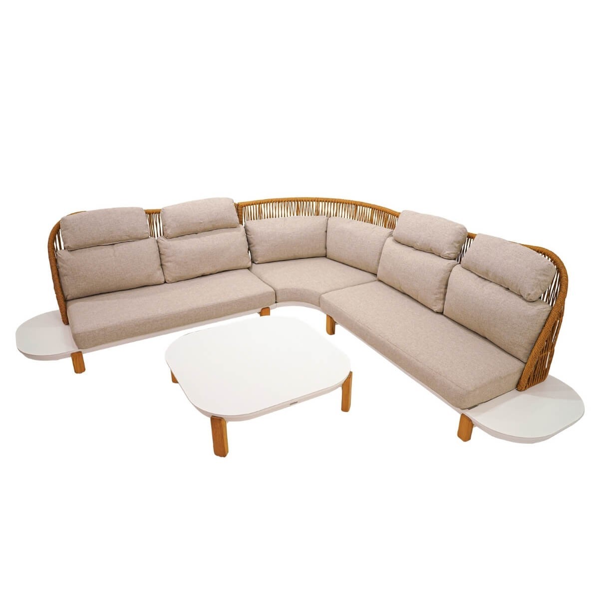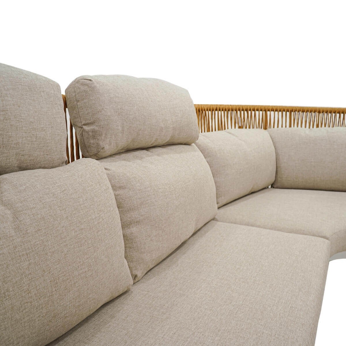 Il design raffinato del divano angolare, realizzato con una struttura in alluminio bianco e schienale intrecciato in rattan di banano, aggiunge un tocco di raffinatezza al tuo giardino o terrazza. I piedi in teak conferiscono una nota di calore e resistenza al set divano, garantendo stabilità e durabilità nel tempo.