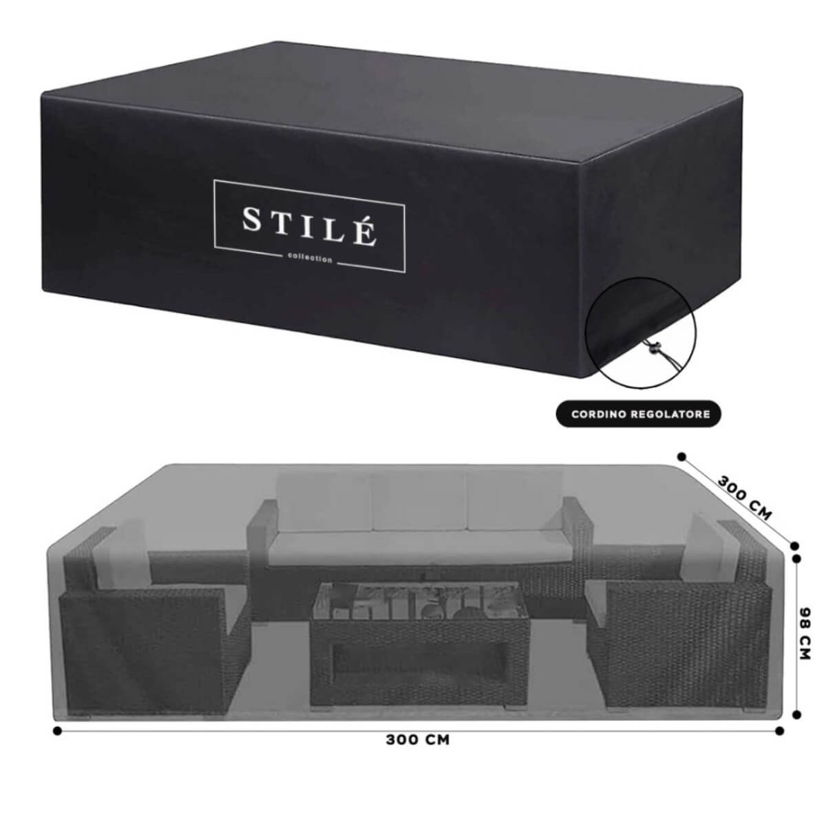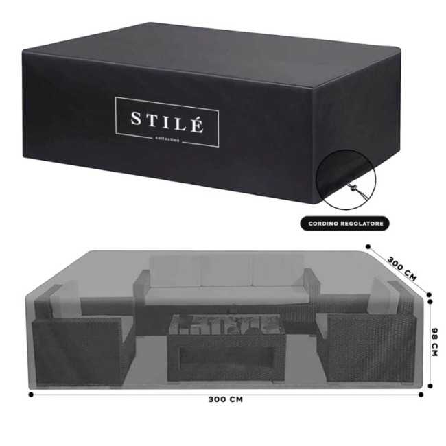 Proteggi il tuo set divani da giardino con la copertura Stilè, progettata per offrire una protezione completa e duratura. Realizzata in Poliestere con tessuto Oxford 210D, questa copertura di dimensioni 300x300xH.98 cm garantisce una difesa efficace contro pioggia, neve e raggi UV grazie al suo strato impermeabile e isotermico.