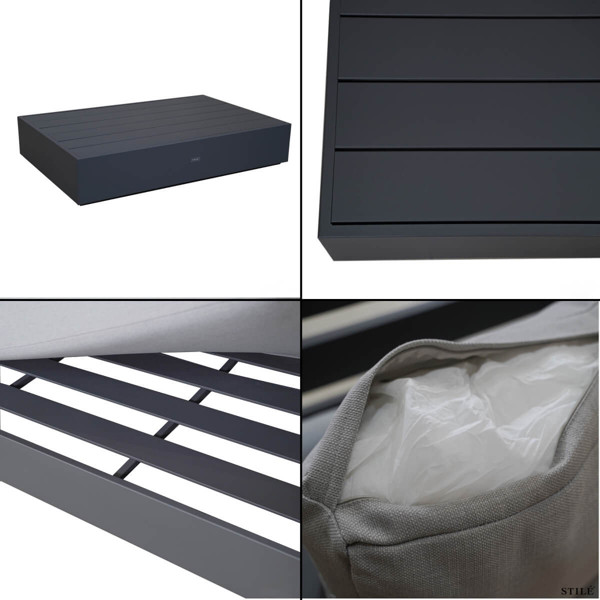 Il set include un ampio divano 3 posti 234 x 82 x H.75 cm, due poltrone 94 x 82 x H.75 cm e un tavolino basso coordinato 120 x 80 x H.23 cm, offrendo una capacità fino a 5/6 posti a sedere. I cuscini in Olifen, con imbottitura drenante e spessore di 15 cm, assicurano un comfort superiore e una rapida asciugatura, ideali per l’uso outdoor. Inoltre, sono completamente sfoderabili, per una manutenzione semplice e veloce.
