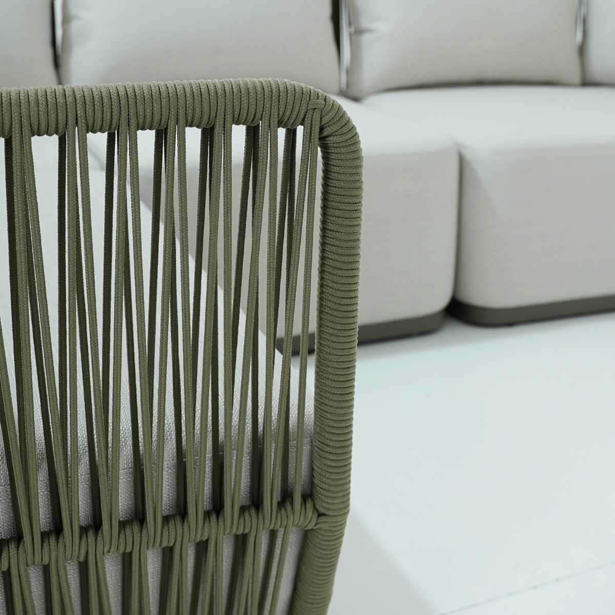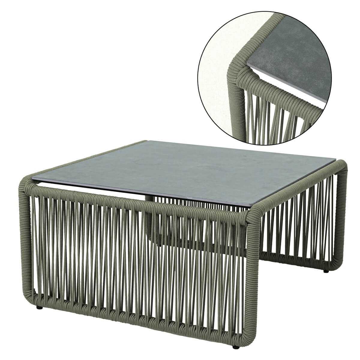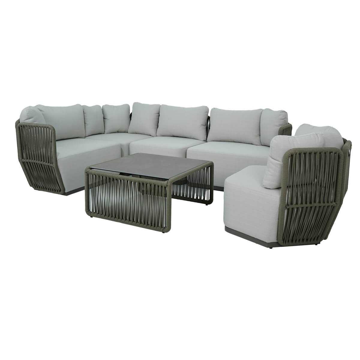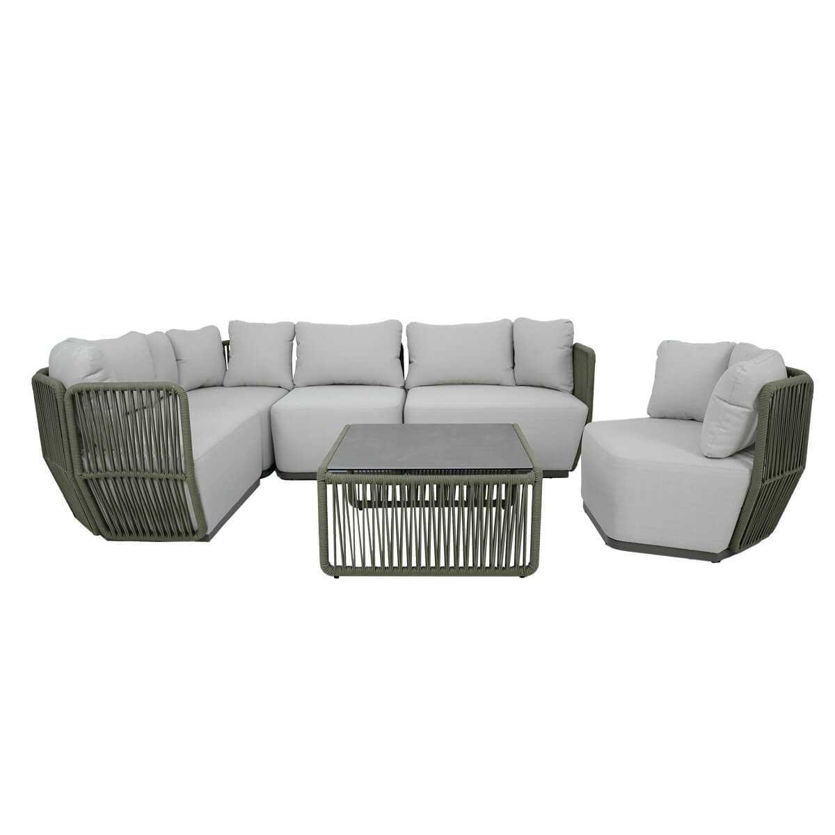 Il divano presenta una struttura in alluminio verniciato a polvere, resistente agli agenti atmosferici, mentre i cuscini sfoderabili sono realizzati in Olifen, un materiale noto per la sua durabilità e resistenza. Il tavolino, con una solida struttura in acciaio inox 201 e un piano in vetroceramica da 8 mm di spessore, aggiunge un tocco di modernità e praticità al set.