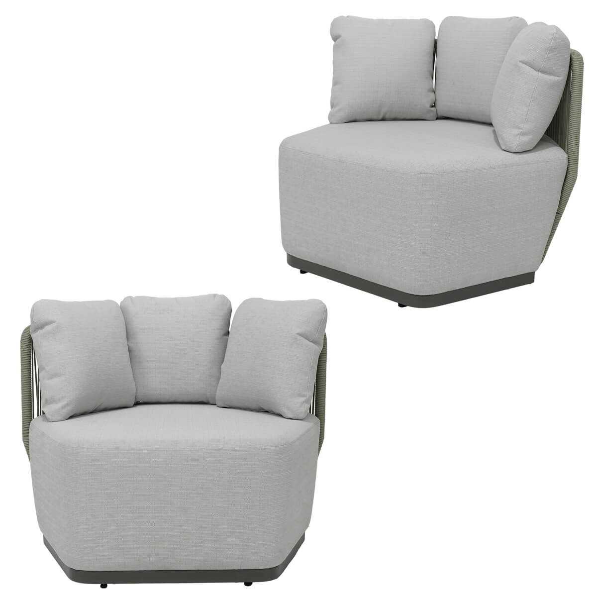 Le dimensioni delle poltrone centrali (cm. 73x87x74), laterali (cm. 105x57x74), angolari (cm. 87x87x74) ed esagonali (cm. 104x87x74) sono state attentamente progettate per offrire il massimo comfort. Il tavolino da cm. 83x83x44 completa il set, fornendo uno spazio funzionale per bevande e snack.