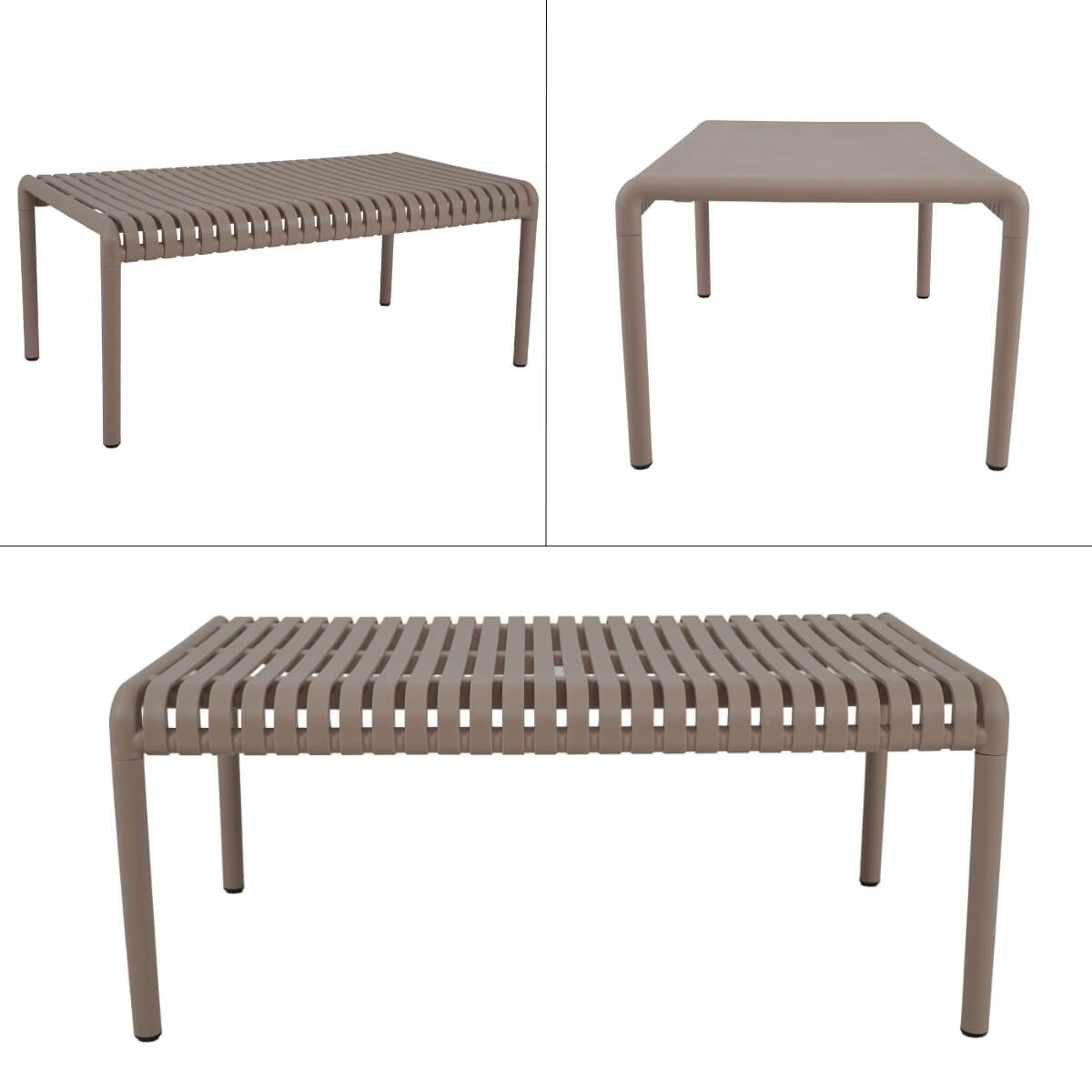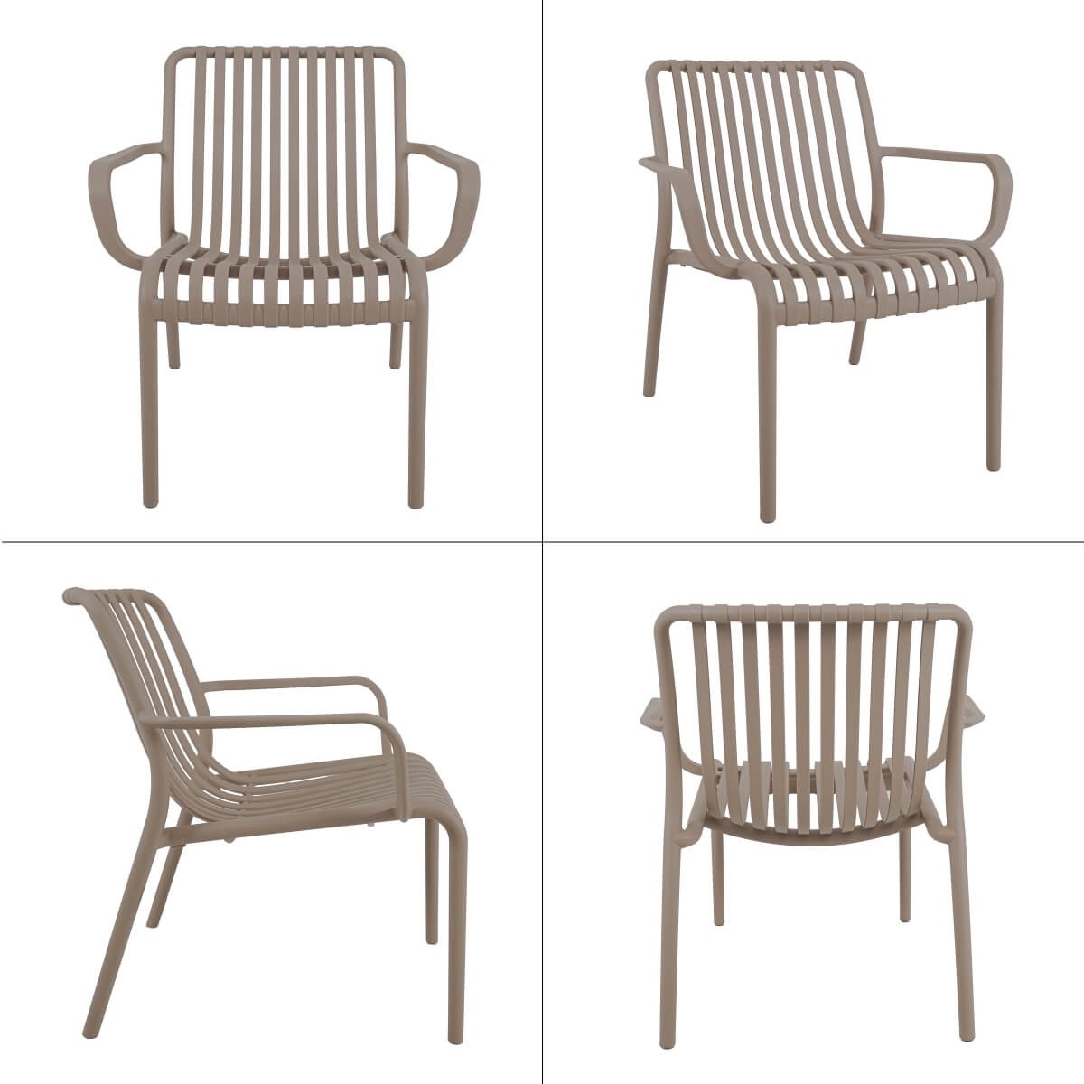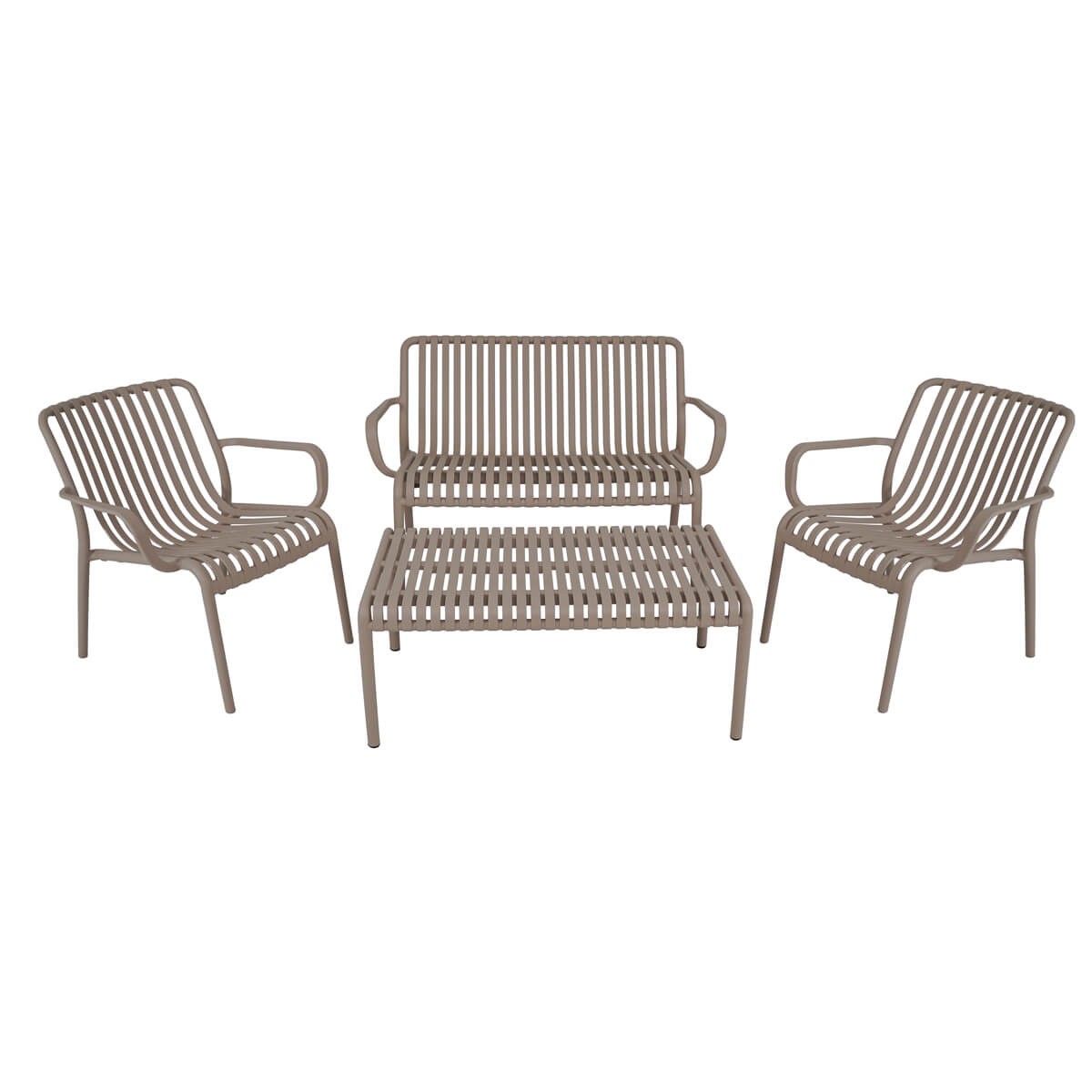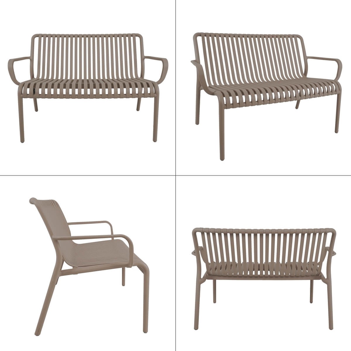 Il design ergonomico a doghe aperte assicura traspirabilità e leggerezza visiva, mentre la struttura in polietilene resistente agli agenti atmosferici garantisce una lunga durata nel tempo senza necessità di manutenzione. Le linee curve delle sedute offrono supporto ottimale, rendendo ogni momento all’aperto ancora più piacevole.