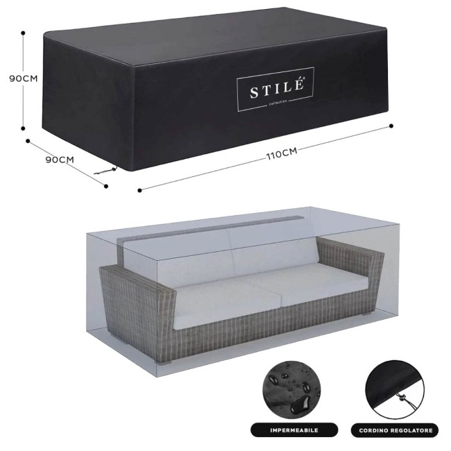 Le dimensioni di 110x90xH.90 cm la rendono perfetta per divani singoli o doppi da giardino, mantenendo i cuscini asciutti e la struttura al riparo da pioggia, sole e polvere. Il cordino regolatore integrato assicura una chiusura salda e personalizzabile, anche in presenza di vento.
