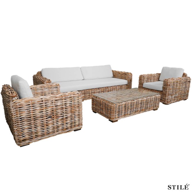 La struttura in mogano rivestito in rattan offre robustezza e durata nel tempo, mentre l’intreccio naturale dona un’estetica calda e accogliente, perfetta per ambienti outdoor di classe. Il tavolino con piano in vetro aggiunge un tocco moderno e pratico, facile da pulire e ideale per completare la zona relax.