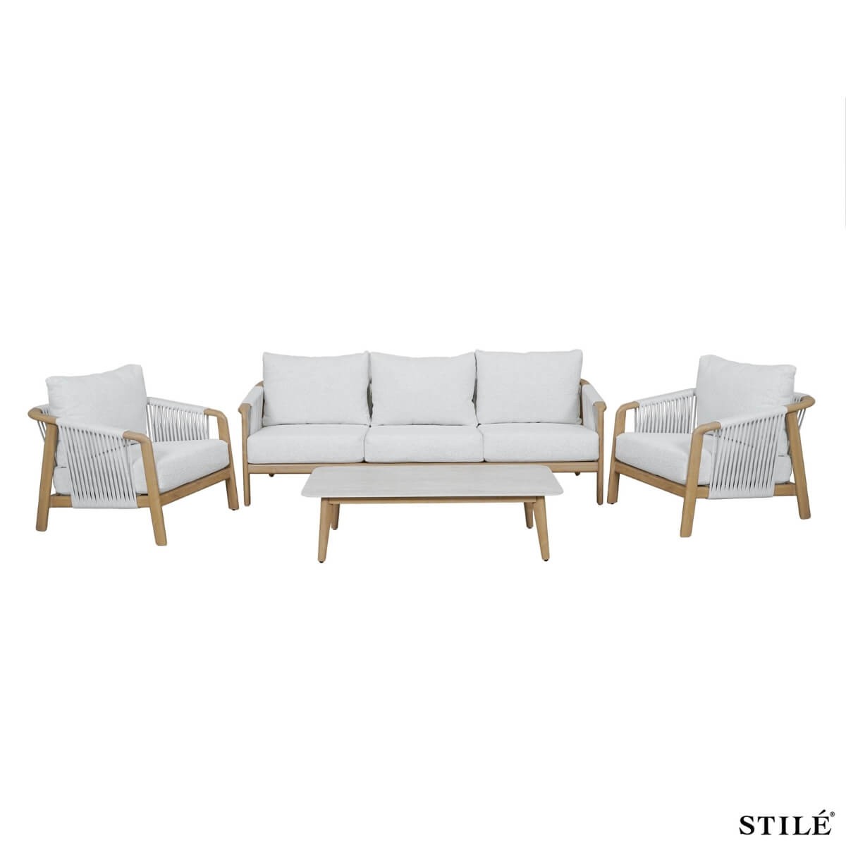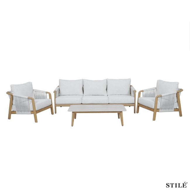 Salotto da Giardino in Alluminio Effetto Legno con Corda Olifen – Set Outdoor con Divano 3 Posti e Tavolino in Pietra