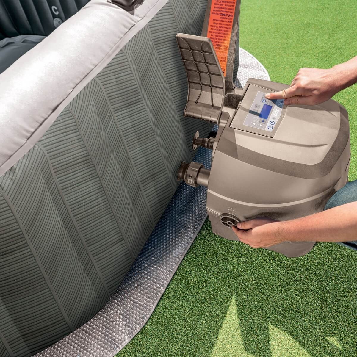 Il pannello di controllo wireless ricaricabile, posizionabile sul bordo della vasca, offre un'interfaccia intuitiva per gestire tutte le funzioni. La Spa è inoltre compatibile con l'app Intex Link™, che consente di controllare le impostazioni direttamente dal tuo smartphone.