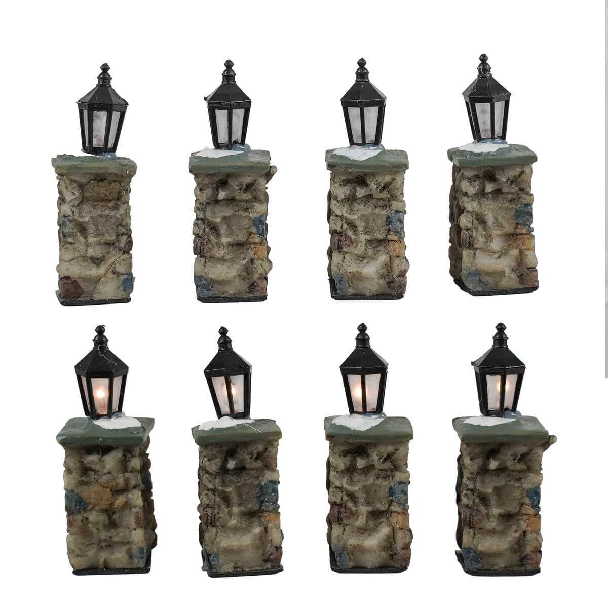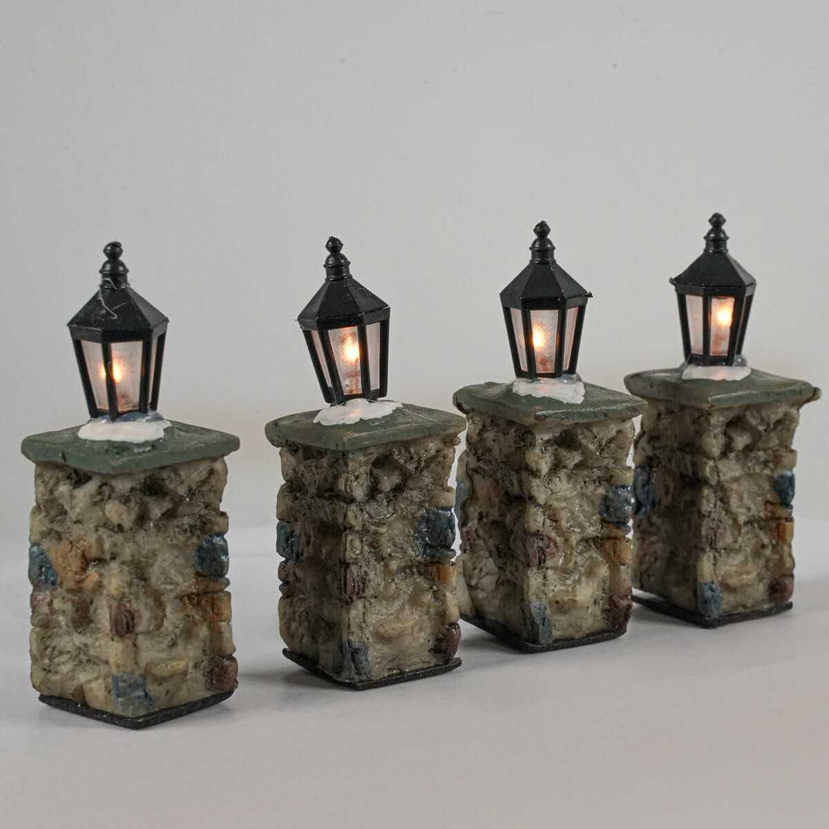 Set di 4 Lanterne Decorative con Colonna in Pietra e Luci Led per Villaggi Natalizi in Miniatura - Stilè Collection
