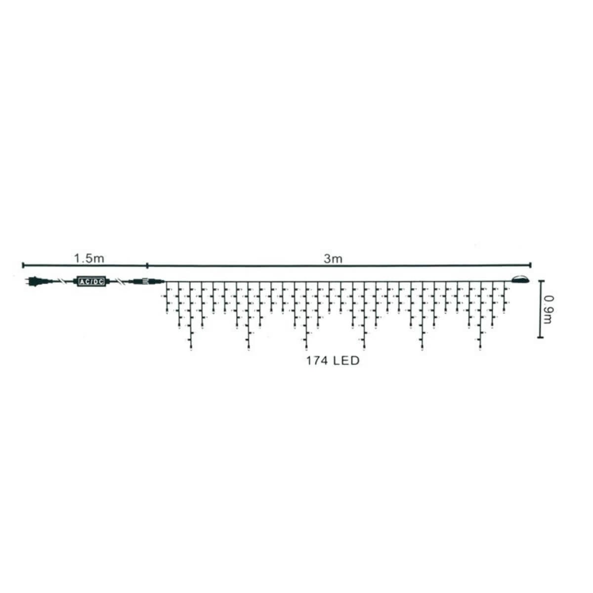 Con una larghezza di 3 metri e un’altezza di 90 cm, questa cascata di luci offre 156 LED fissi e 18 flash LED bianco freddo, per un effetto luminoso brillante e dinamico.