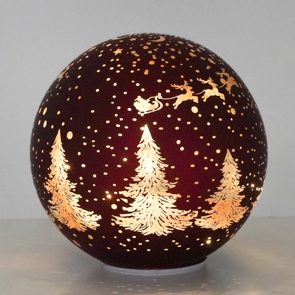 Realizzata in vetro di alta qualità, la sfera è impreziosita da un incantevole decoro natalizio con alberi dorati e la slitta di Babbo Natale con le renne, che si illuminano grazie a un sistema LED interno. La particolarità? Ruota su se stessa, creando un effetto visivo affascinante che incanta grandi e piccini.