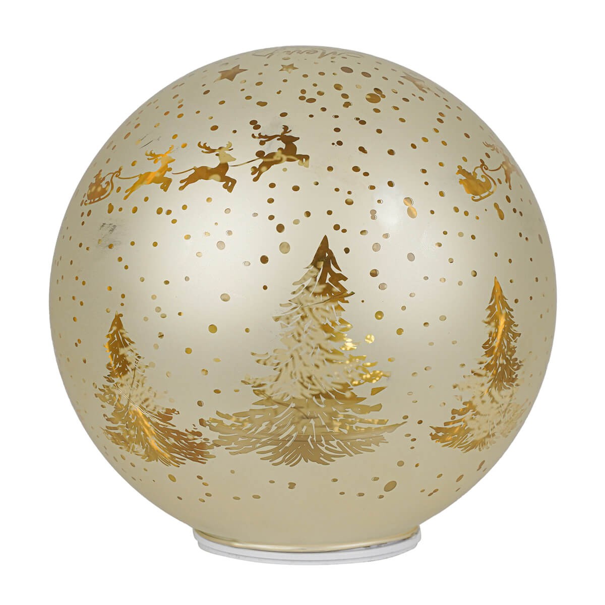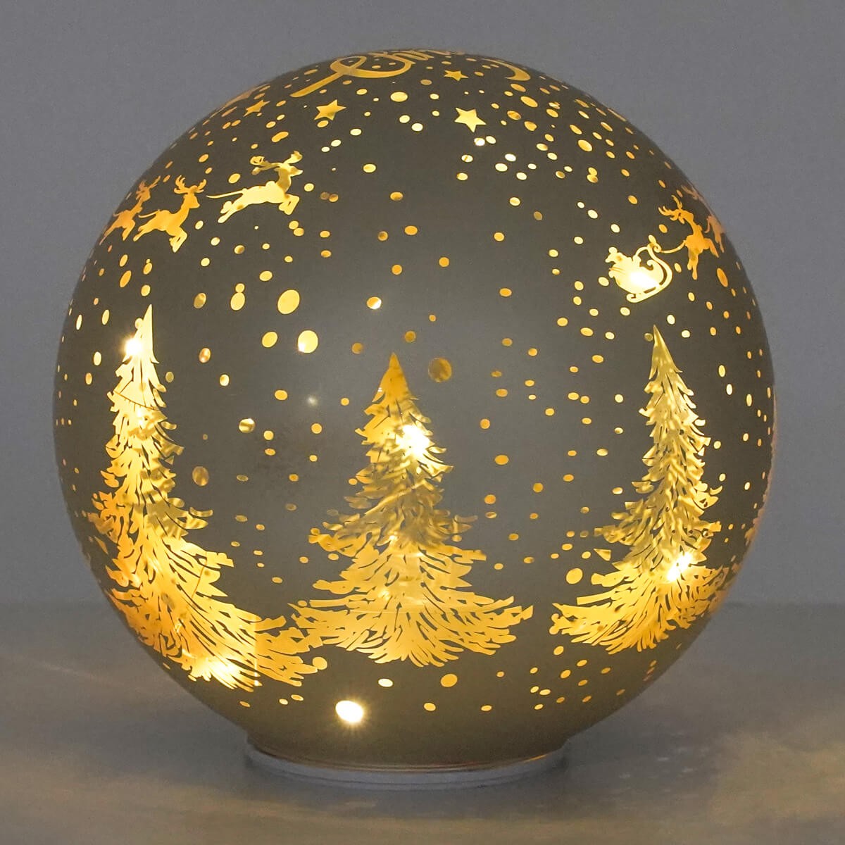 Realizzata in vetro di alta qualità, la sfera è impreziosita da un incantevole decoro natalizio con alberi dorati e la slitta di Babbo Natale con le renne, che si illuminano grazie a un sistema LED interno. La particolarità? Ruota su se stessa, creando un effetto visivo affascinante che incanta grandi e piccini.