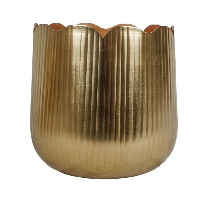 Raffina i tuoi ambienti con il vaso in metallo color oro, un elemento d’arredo dal fascino contemporaneo e dal carattere raffinato. Realizzato con una finitura dorata lucente e rigature verticali, questo vaso si distingue per il suo bordo sagomato effetto petalo, che dona movimento e leggerezza alla forma.