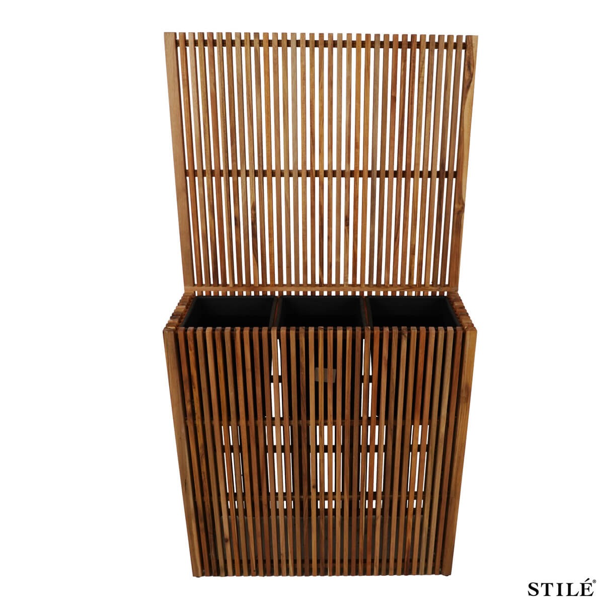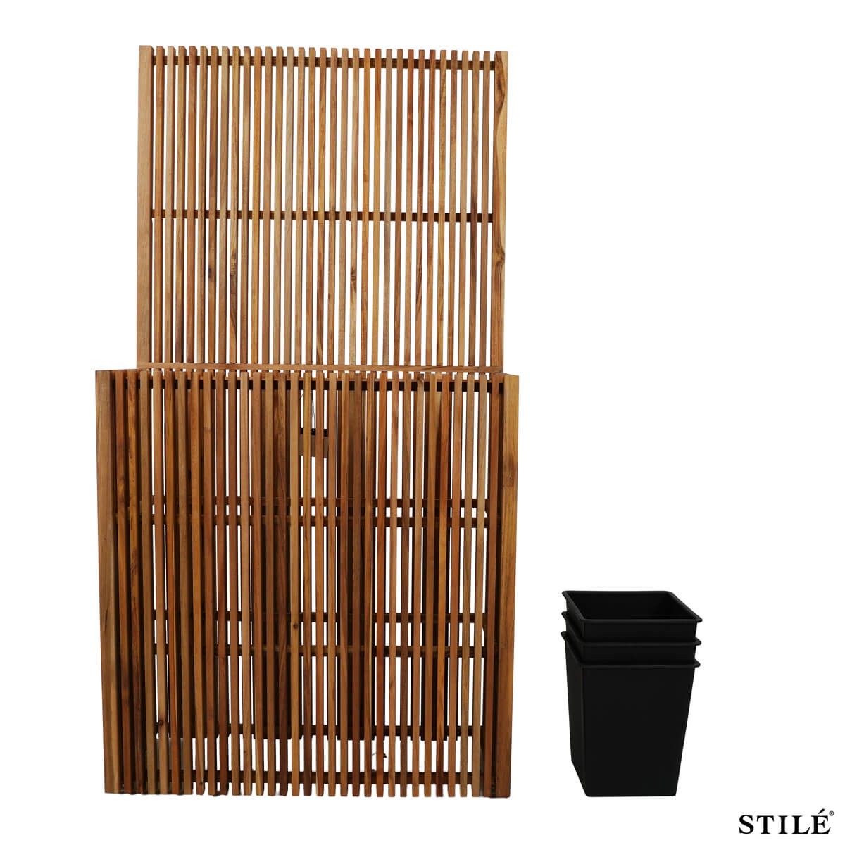 Il vaso è dotato di tre vasi interni neri in plastica, pratici e removibili, ideali per organizzare piante verdi, fiori o rampicanti in modo ordinato e funzionale. Il pannello verticale alto 150 cm offre un ottimo supporto per piante rampicanti o separazioni decorative, garantendo privacy e un forte impatto visivo.