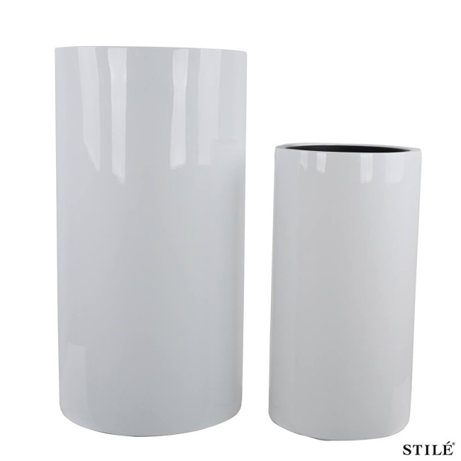 Dona un tocco di eleganza contemporanea ai tuoi spazi con questo raffinato set di 2 vasi bianchi laccati lucidi, perfetto per valorizzare ambienti interni ed esterni coperti. Il design cilindrico slanciato, abbinato alla finitura lucida, rende questi vasi ideali per arredamenti moderni, minimal e di tendenza.
