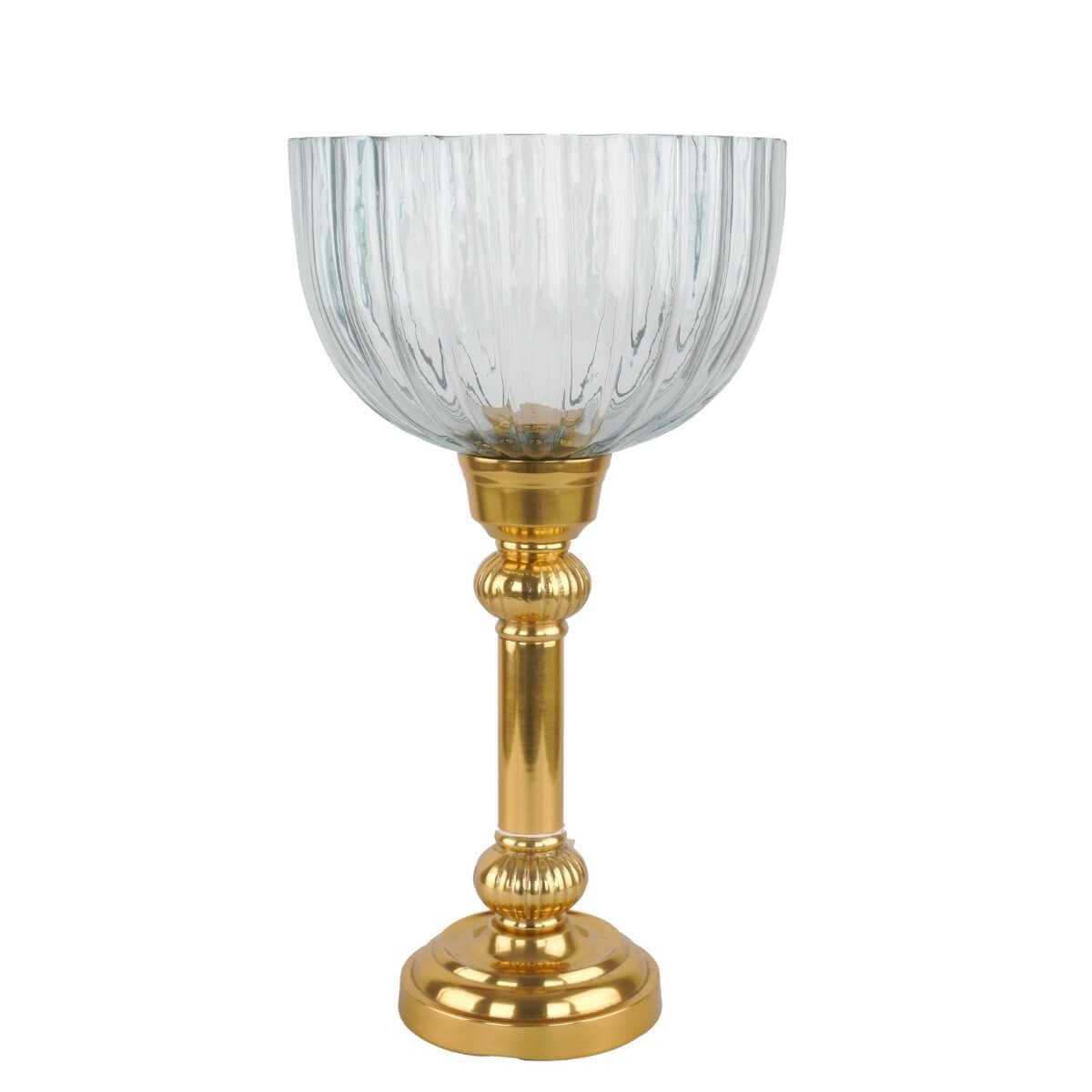 Scopri l'eleganza senza tempo con la nostra coppa decorativa, un'opera d'arte in vetro e alluminio con finitura oro. Disponibile in due dimensioni, L (D.22,5xH.42 cm) e M (D.27xH.22 cm), questa coppa è perfetta per aggiungere un tocco di lusso a qualsiasi ambiente. Ideale come centro tavola o come parte di una composizione decorativa su consolle o caminetti, questa coppa si adatta splendidamente a interni moderni e classici, offrendo un tocco sofisticato ed elegante.
