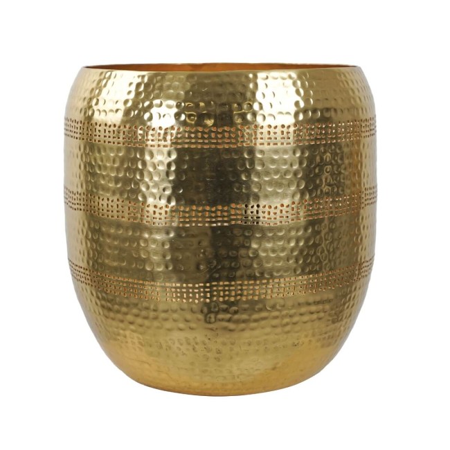 Porta luce, eleganza e raffinatezza nei tuoi ambienti con questo vaso decorativo oro in alluminio, caratterizzato da una raffinata lavorazione martellata e fasce orizzontali incise a motivo geometrico. Il design curvo e armonioso lo rende un elemento d’arredo distintivo, perfetto per interni sofisticati, vetrine di negozi, showroom o allestimenti di prestigio.