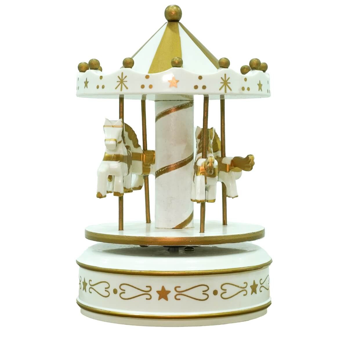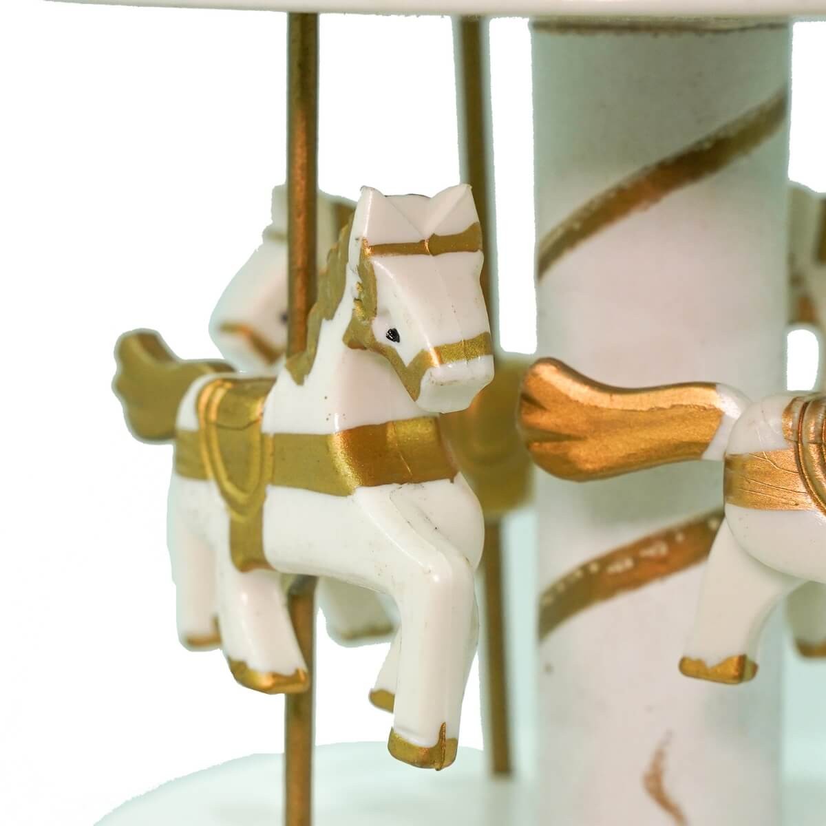 Realizzata con cavalli finemente decorati e una struttura in stile vintage, la giostra ruota dolcemente mentre diffonde una melodia natalizia. Ideale come regalo o pezzo da collezione, è disponibile in 4 varianti colore per adattarsi a ogni stile di arredamento: rosa acceso, rosa cipria, azzurro e bianco dorato.