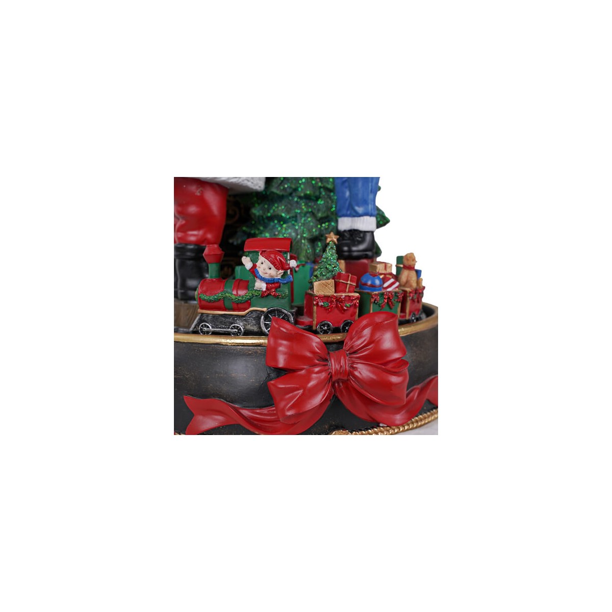 La struttura in resina, solida e durevole, è impreziosita da una base decorata con dettagli dorati e un grande fiocco rosso frontale, perfetto per chi ama le ambientazioni natalizie classiche ma scenografiche. Dotato di alimentazione a 12V (800mA), il carillon include un pannello posteriore con interruttore on/off e regolatore di volume, offrendo un controllo pratico e intuitivo.